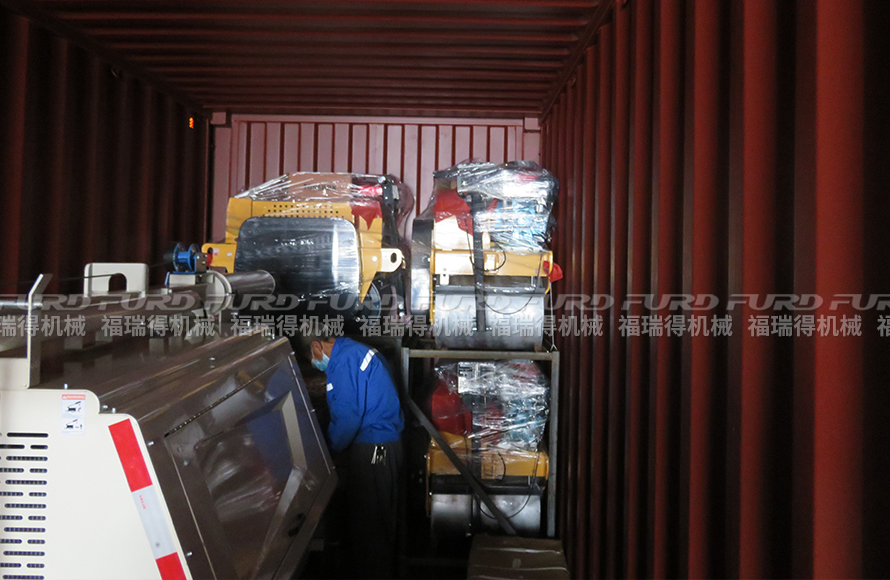 福瑞得機(jī)械壓路機(jī)和移動(dòng)燈車打包裝車出口非洲